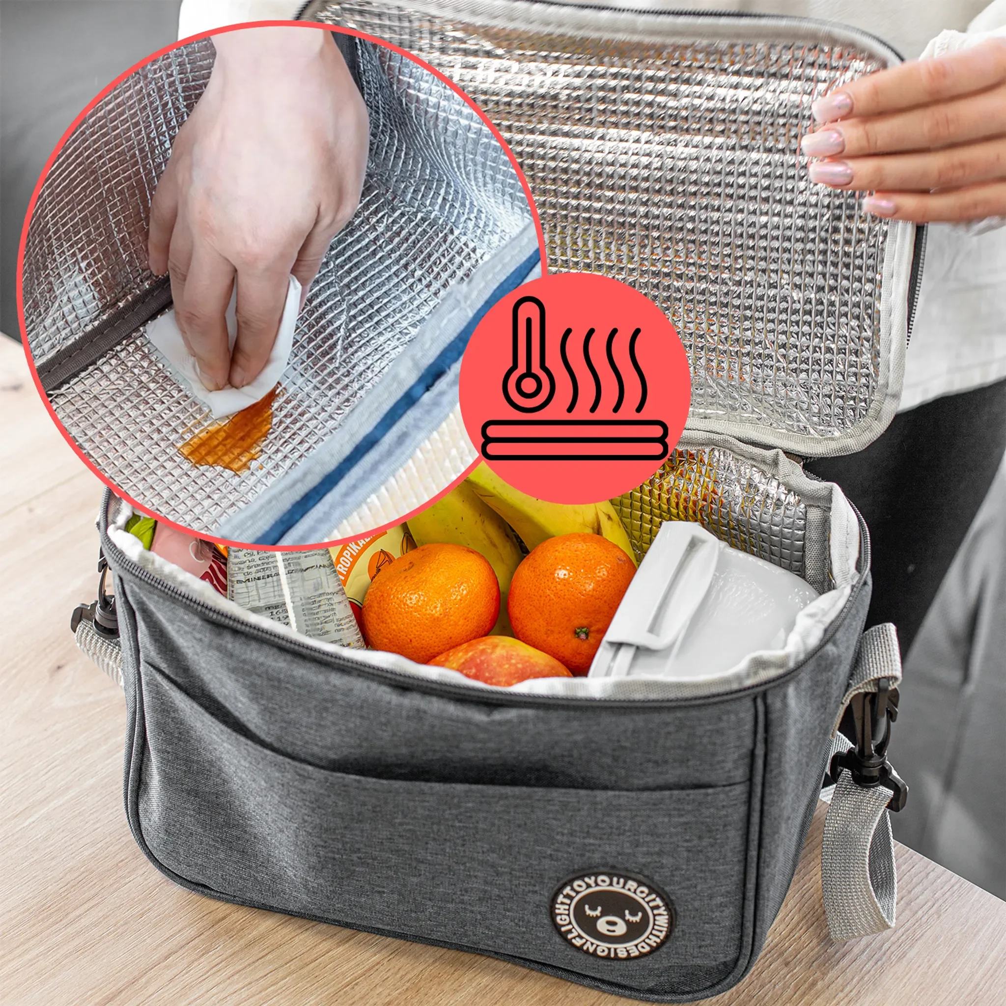 Das wasserdichte Innenfutter mit Aluminium-Beschichtung sorgt für optimale Isolierung und einfache Reinigung. Dank der durchdachten Größe eignet sich die Kühltasche perfekt für Lunch, Snacks oder Getränke unterwegs.